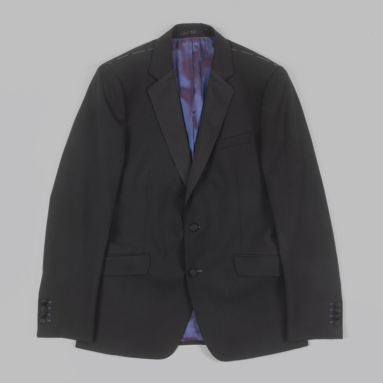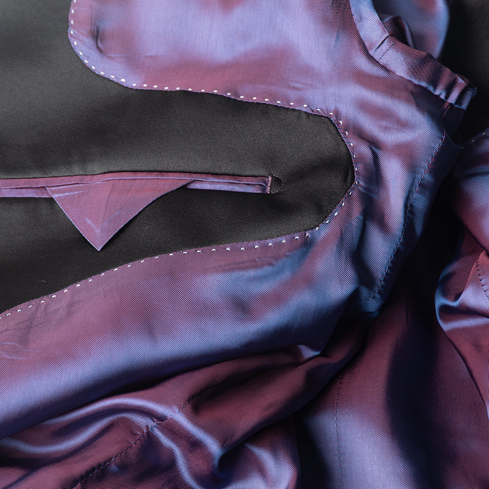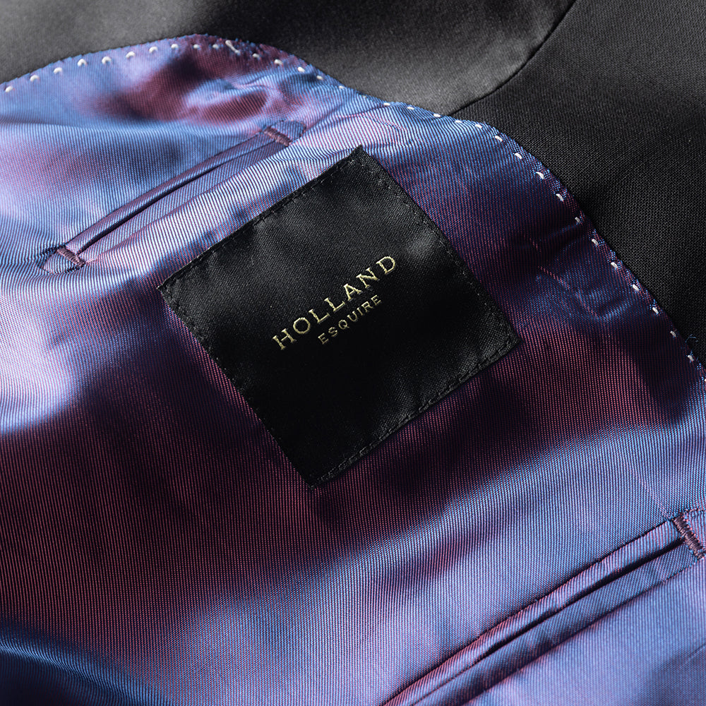 A classic notch lapel two button Dinner suit with a Satin peak lapel, complemented with a purple changeant viscose lining. Made from a Wool Blend stretch Fabric for comfort.