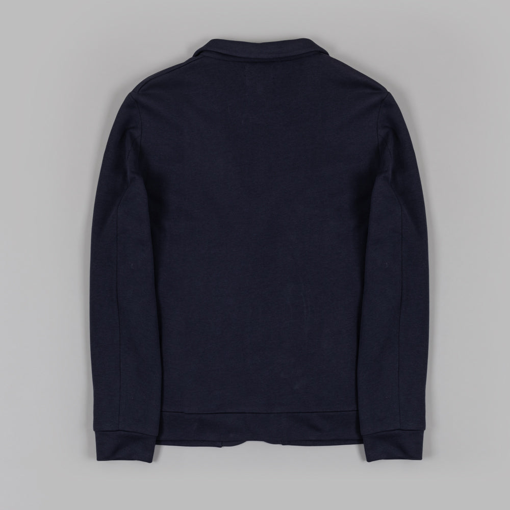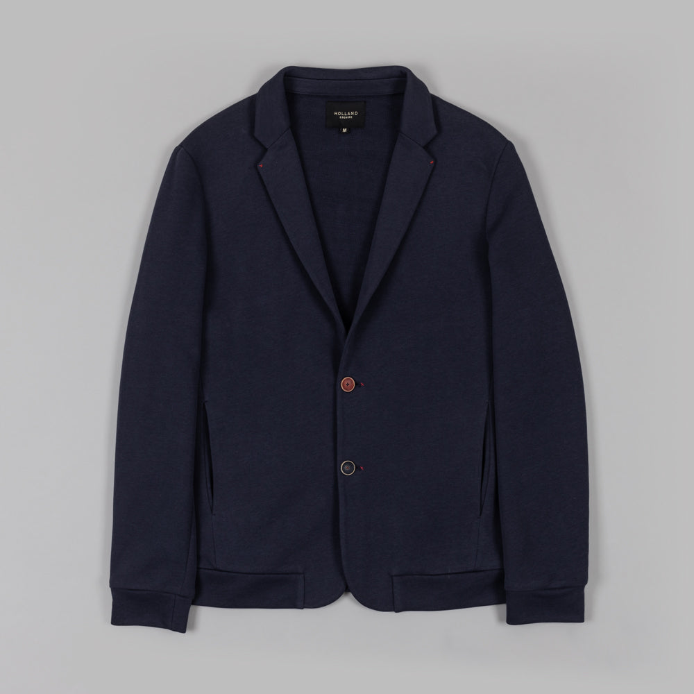 A hybrid inspired casual two button jersey blazer. Made from a heavy jersey loop back Cotton sweat fabric. Side seam pocket and ribbed cuffs and hem make it a true blazer sweatshirt hybrid. Hand customised with red crosses making every piece unique.