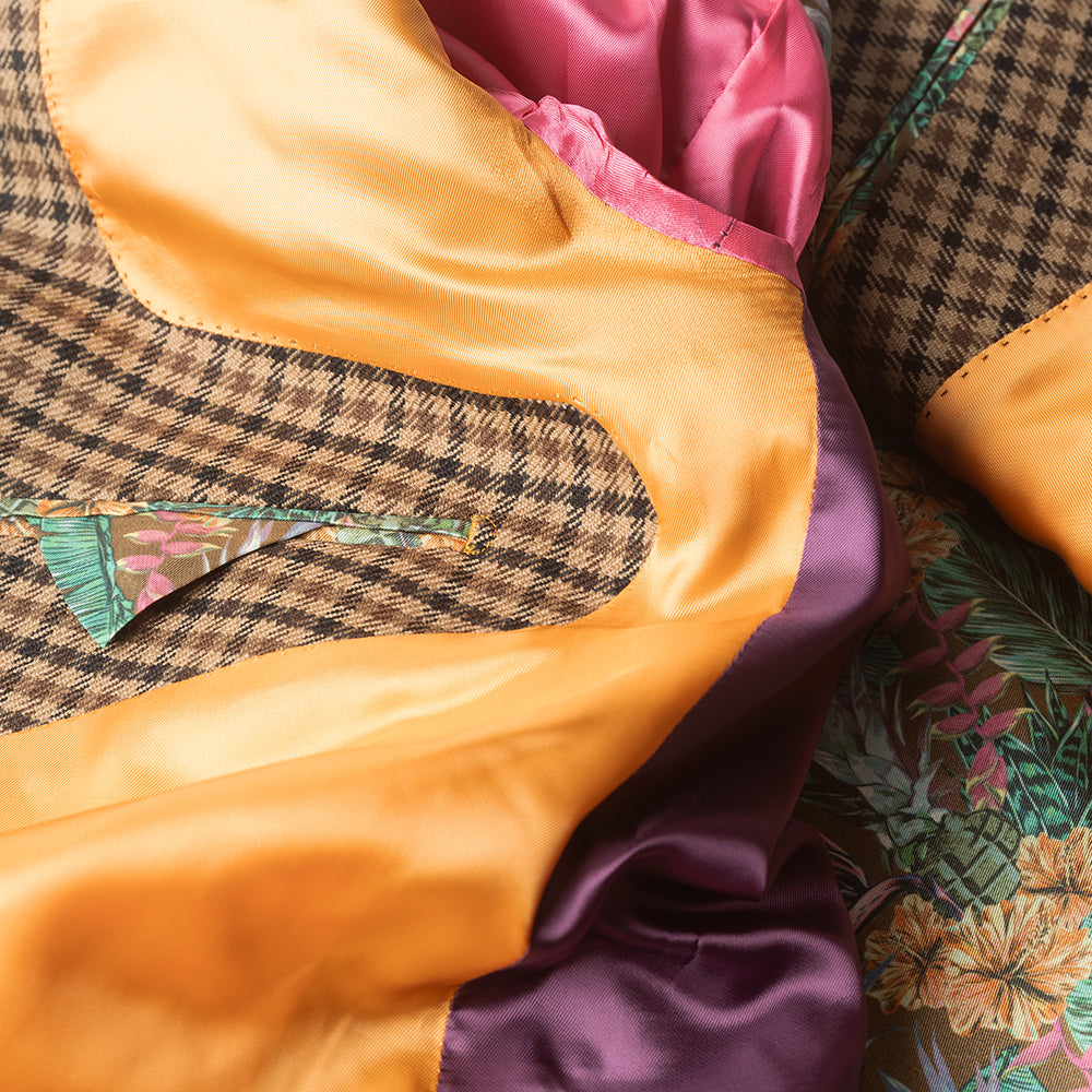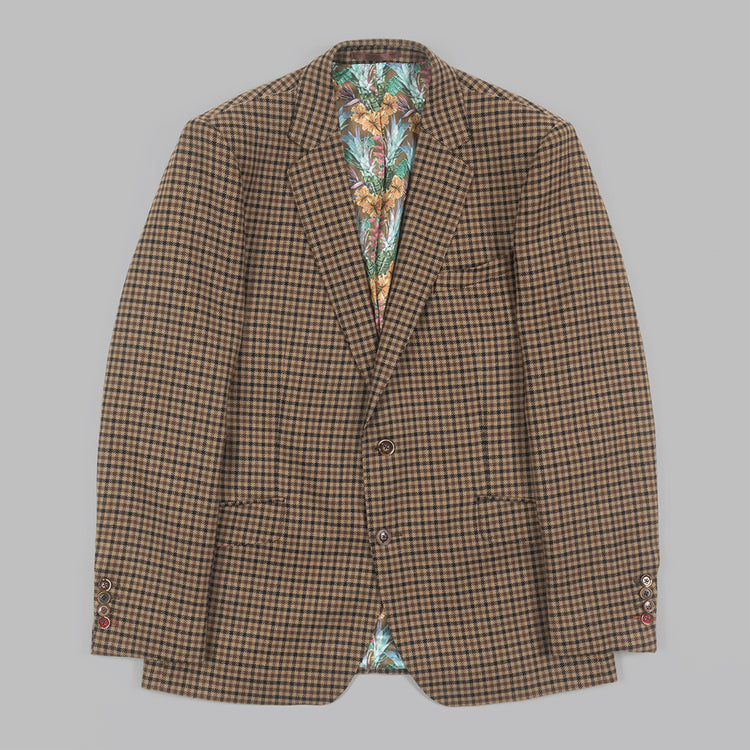 A classic single breasted two button tailored Blazer with hand grenade floral lining Lining. Woven from 100% Lambswool brown and black dogs tooth fabricc