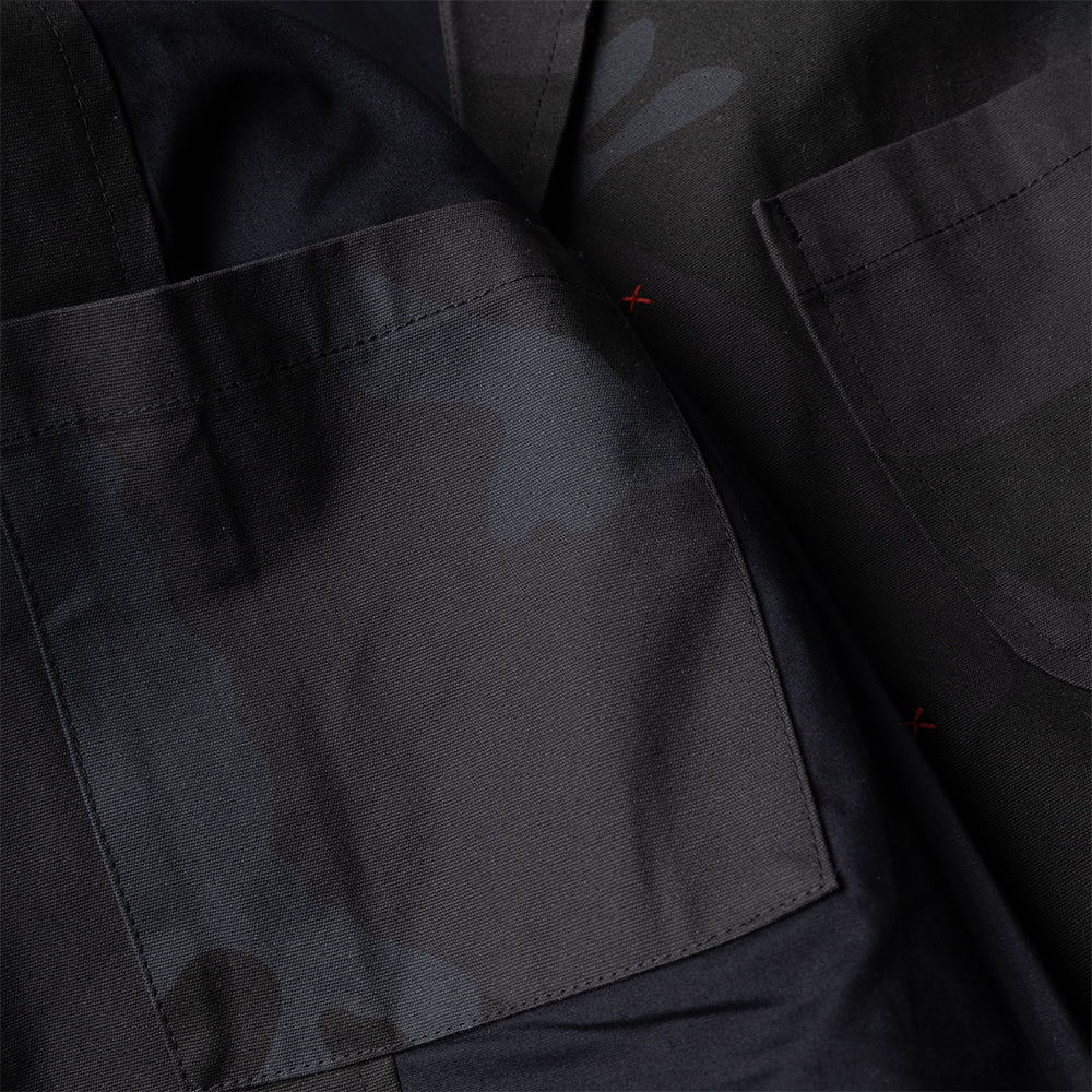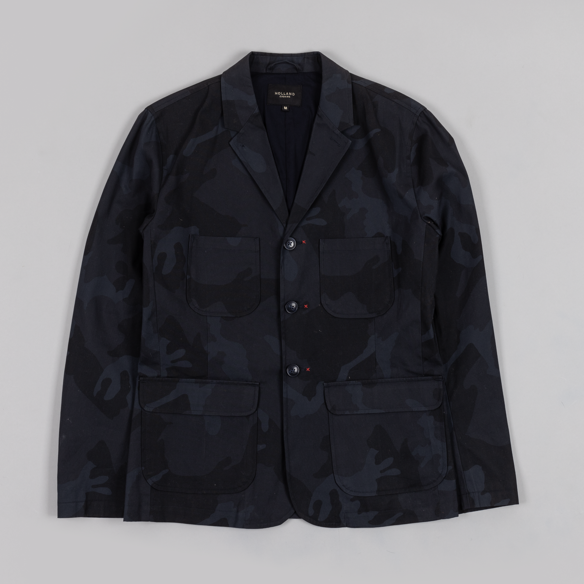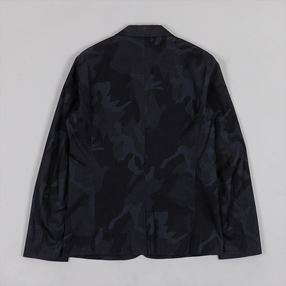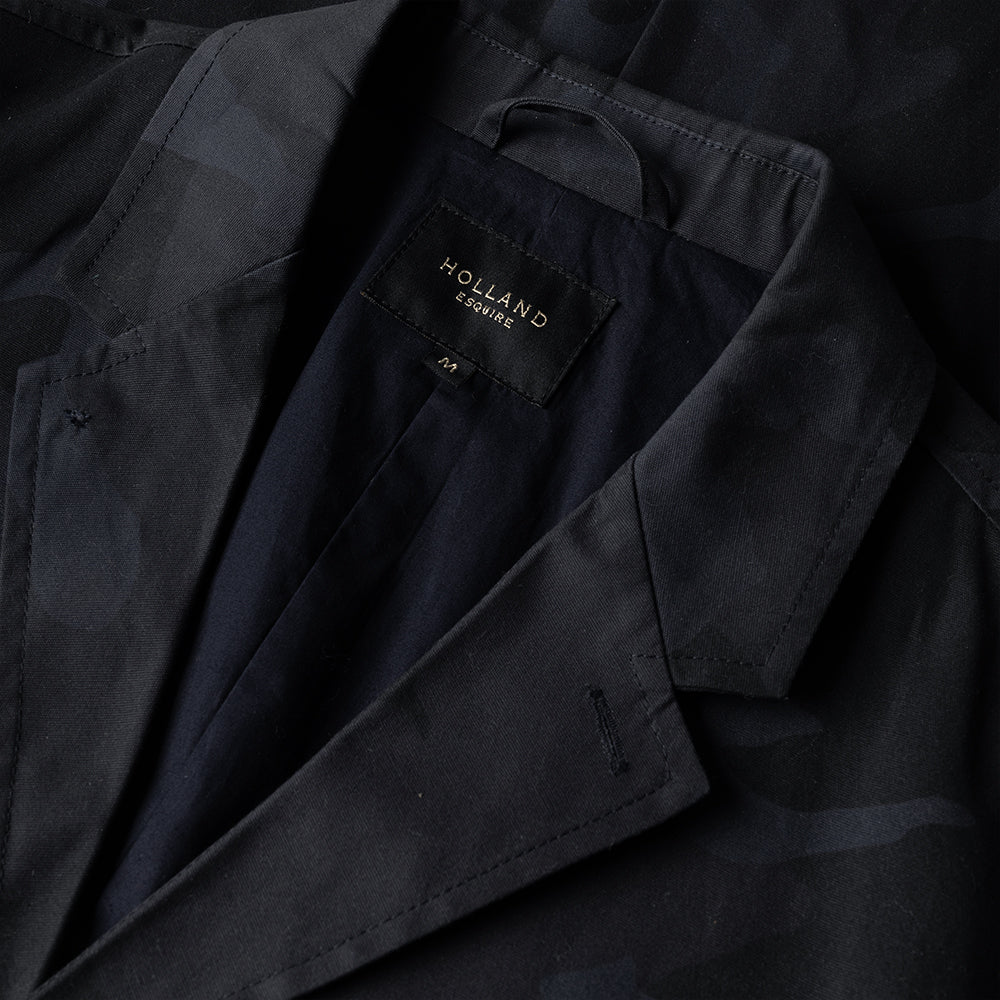 A casual deconstructed three button blazer in a subtle Navy cotton Camouflage fabric. Fully lined in navy cotton poplin. Detailed with Four patch pockets, a centre vent, a top button and an open casual cuff. Hand customised red crosses making every piece unique.