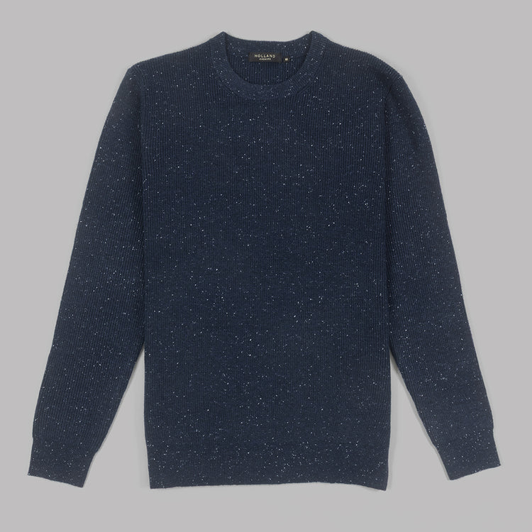 A classic navy crew neck jumper in a wool blend fleck knit.