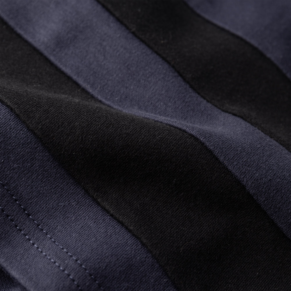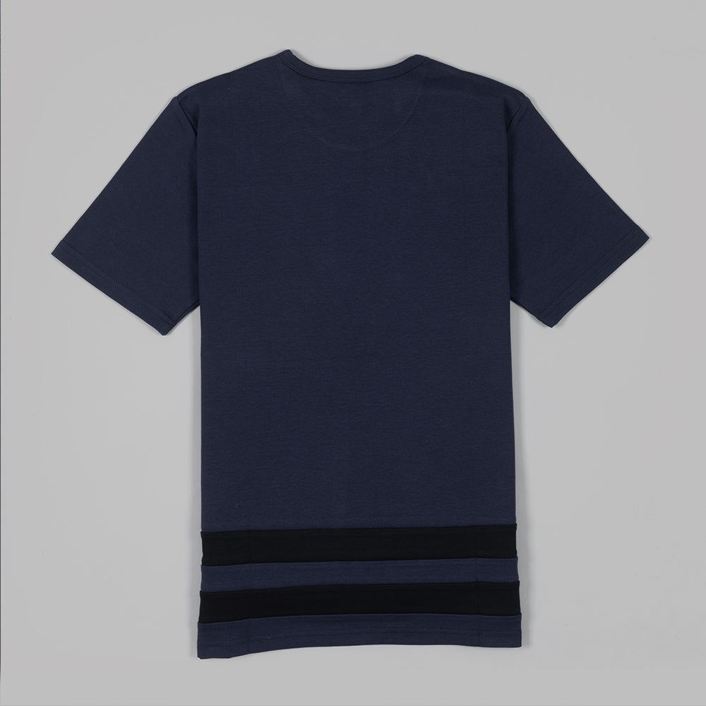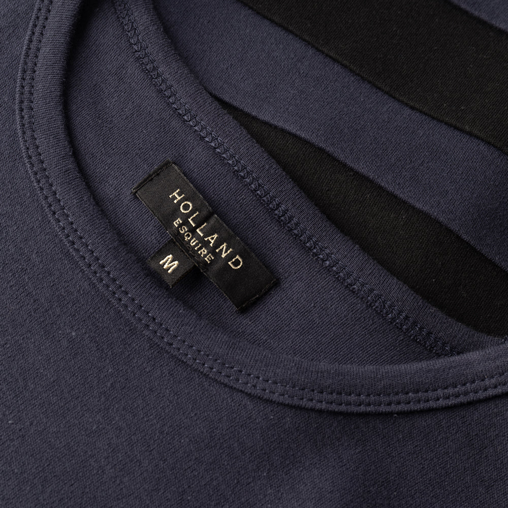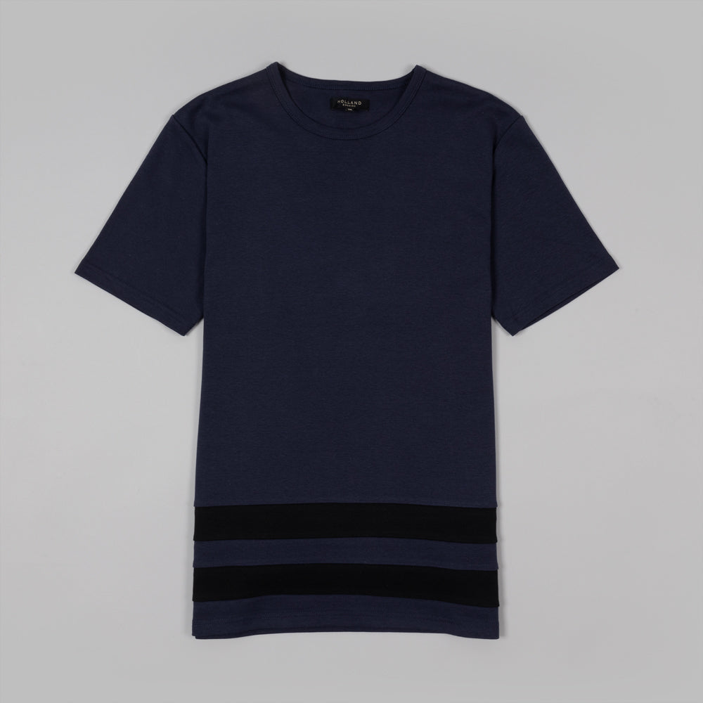 A classic tee in a blue jersey with two black stripes at the hem. Made from 100% cotton jersey interlock for a luxury touch.